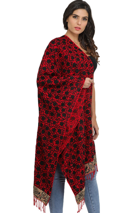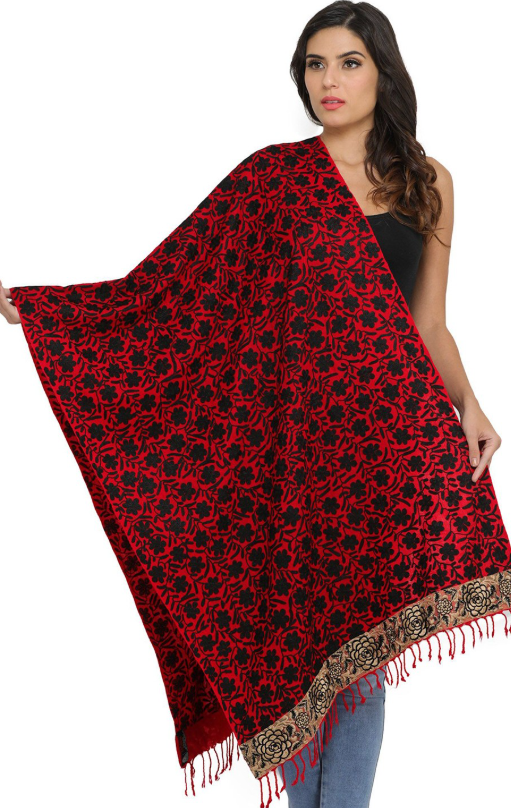 Pashmkala Women Red And Black Embroidered Flower and Roses on Border Wool Phulkari Stole